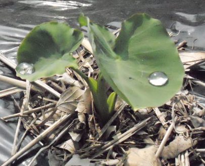 サトイモ……成長中。藁の間から芽が見えるようになった